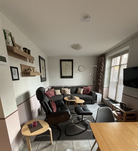 Gemütlicher Wohnbereich mit Wohnlandschaft, Relaxsessel mit Hocker, SAT-TV, DVD-Player, Radio und Ausgang in den Garten.