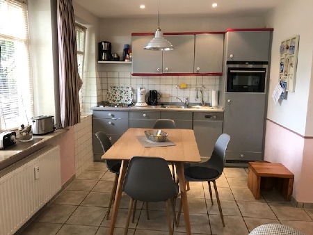Voll eingerichtete Küche mit Mikrowellenbackofen, Ceranfeld, Spülmaschine, Wasser- und Eierkocher, Kaffee- und Kaffeepadmaschine, Toaster.